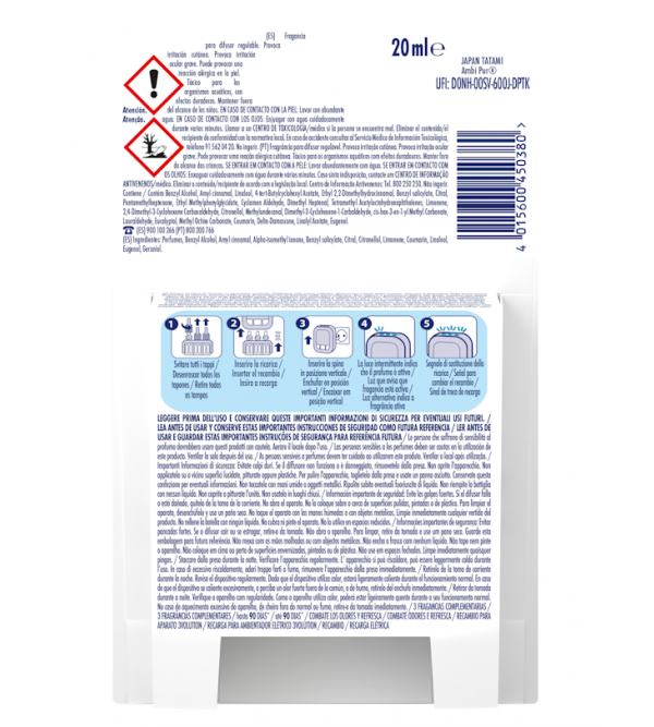 Ambi Pur 3Volution Infinity Tatami Japonés elimina de forma continua los olores y alterna entre 3 aromas complementarios para que siempre te sorprendas Dura hasta 90 días (si se usa 12 h al día en posición baja) Descubre la belleza de Tatami Japonés ahora con el efecto doble en comparación con la línea base de Ambi Pur: Aroma intenso de mayor alcance que llena tu hogar de fragancia Con la fragancia Tatami Japonés, escápate a la tierra del país del sol naciente para disfrutar del aire fresco y puro en armonía con la naturaleza Déjate invadir por una sensación de calma mientras su fragancia limpia y suave inunda tu hogar Con los ambientadores tradicionales, nos acostumbramos a los aromas rápidamente y dejamos de apreciarlos Ambi Pur 3Volution renueva la frescura de forma continua y automática alternando entre 3 fragancias complementarias de alta calidad cada 45 minutos Utiliza los recambios Ambi Pur 3Volution con el difusor eléctrico 3Volution para llenar tu hogar de aromas frescos y fragancias que te seguirán cautivando día tras día, semana tras semana 3Volution también te permite ajustar el nivel de aroma para que crees el ambiente que quieras, cuando quieras Elimina de forma continua los olores y alterna entre 3 aromas complementarios de frescura duradera Dura hasta 90 días (si se usa 12 h al día en posición baja) Infinity Tatami Japonés con efecto doble: aroma intenso de mayor alcance Escápate a la tierra del país del sol naciente para disfrutar del aire puro y fresco 3Volution con tecnología Odourclear elimina continuamente los olores dejando un aroma fresco y ligero
