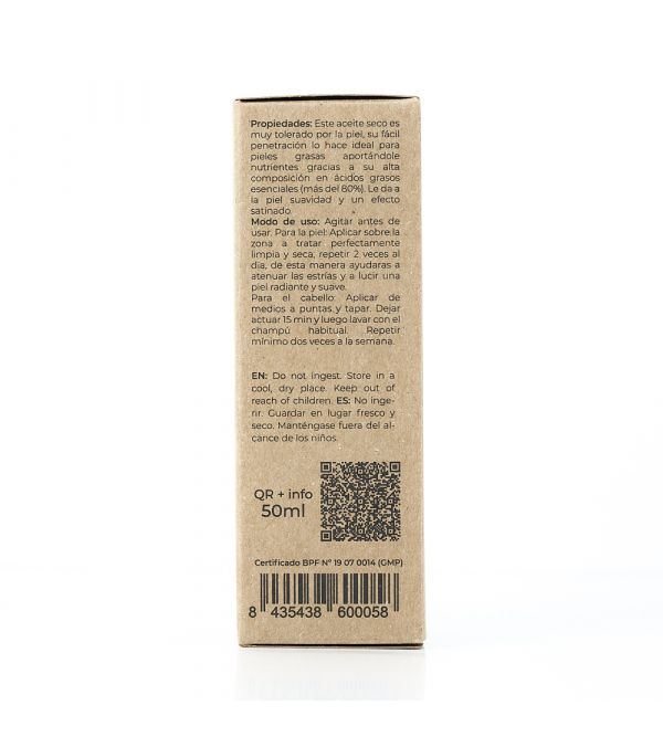 Este aceite seco es muy tolerado por la piel, su fácil penetración lo hace ideal para pieles grasas aportándole nutrientes gracias a su alta composición en ácidos grasos esenciales (más del 80%). Le da a la piel suavidad y un efecto satinado.