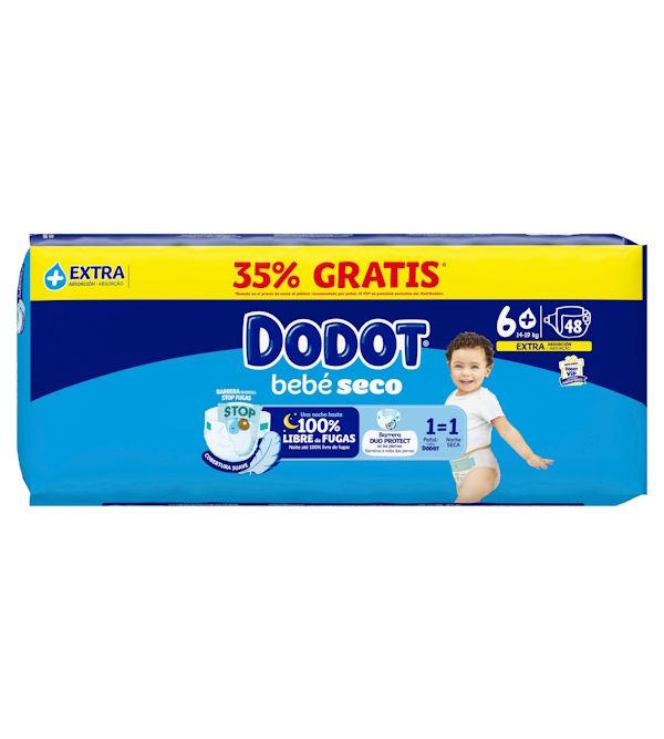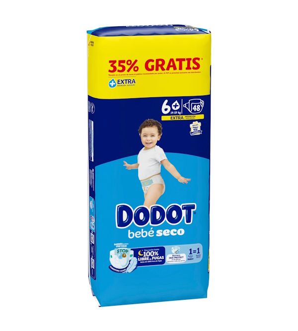Hasta 100% libre de fugas toda la noche con Dodot Bebé Seco pañal y su barrera Stop Fugas, triple capa absorbente, 2x protección en piernas para evitar los escapes laterales y Flexi-Tiras para un ajuste cómodo. Testado dermatológicamente. ¡Tan Tan seco, Tan Tan Dodot!