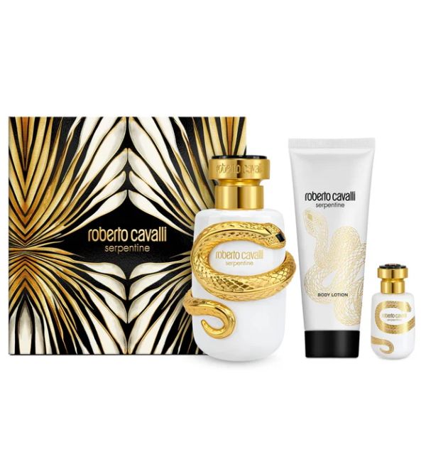 Serpentine es un perfume dinámico de intrépida sensualidad, diseñado para la mujer que se mueve con una confianza hipnótica, tentadora y sensual. El frasco refleja la opulencia de la fragancia que contiene. Está adornado con una serpiente dorada que envuelve el frasco blanco; este elemento distintivo evoca el diseño de los accesorios de moda de Roberto Cavalli.
