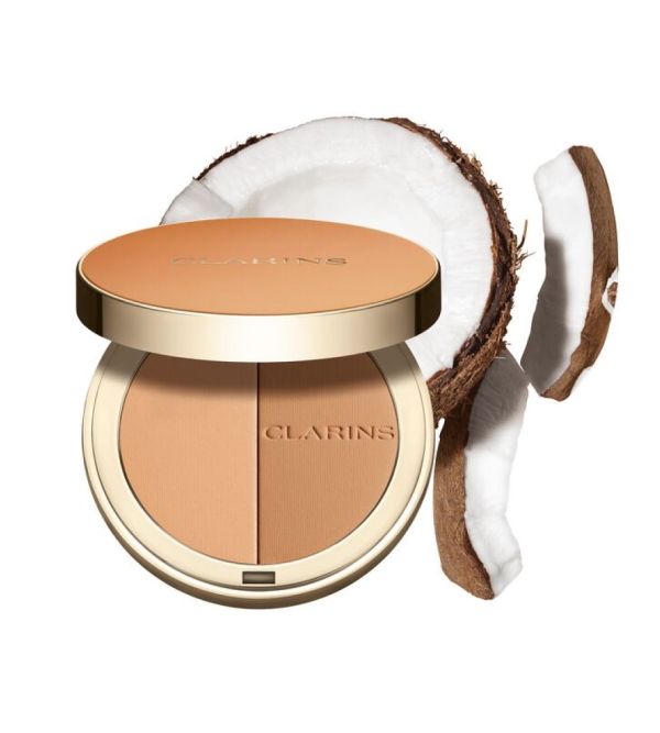 Aplicar los polvos compactos en el conjunto del rostro y el cuello con una esponja, la borla o la brocha para polvos Clarins para una tez nutrida y bronceada.