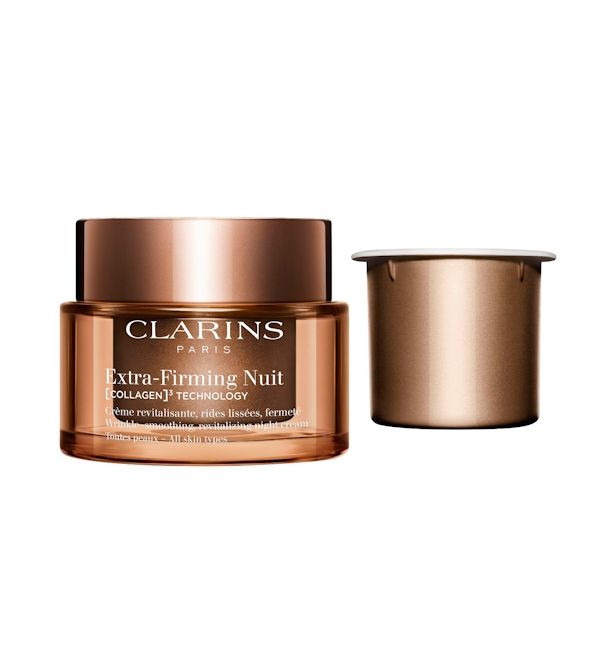 La crema reafirmante de noche con TECNOLOGÍA [COLÁGENO]³ está diseñada para actuar eficazmente sobre la cantidad, calidad y estructura del colágeno, aumentando en un 53%** sus reservas y dejando la piel visiblemente más firme en tan solo 7 días*. Su fórmula exclusiva combina tres potentes activos pro-colágeno —polipéptidos de colágeno, extracto de árbol de pecán y extracto de mitracarpus bio— con la niacinamida, conocida como la molécula de juventud, que mejora la textura de la piel y potencia su luminosidad. Enriquecida con más de un millón de péptidos de aguacate**** en cada crema de 50 ml, ayuda a que la piel se regenere durante la noche, logrando un rostro más descansado, firme y terso al despertar. Las arrugas se alisan, los pómulos se rellenan y el contorno facial se redefine, mientras su textura envolvente, desarrollada por los Laboratorios Clarins, proporciona confort sin sensación grasa. Además, las cremas Extra-Firming son recargables, reforzando el compromiso con la sostenibilidad. *Prueba de consumidores Extra-Firming Jour & Nuit, 107 mujeres. **Estudio ex vivo en piel fotoenvejecida. ***Exclusivo de Clarins. ****Cantidad estimada en una crema de 50 ml.