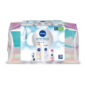 Este pack contiene una Nivea Q10 Loción Corporal Reafirmante, un Gel de Ducha Creme Care, un Desodorante Black & White Invisible Fresh Roll On y un Desmaquillador de Ojos Iluminador Vitamina C.