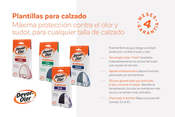 • Plantillas: Classic, Super, Sport, ultra fina, desodorantes; todas ellas con triple protección contra el olor, además, absorben el sudor conservando los pies secos y descansados.