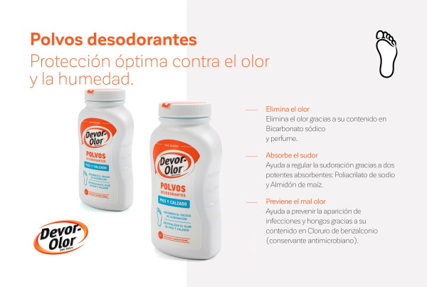 Devor-Olor es una de las marcas más reconocidas en la elaboración de productos para eliminar el mal olor y la sudoración excesiva de los pies. Todos los productos de la gama están fabricados con fórmulas muy potentes para conseguir neutralizar los ácidos que ocasionan el mal olor, al mismo tiempo que cuidan y protegen los pies.