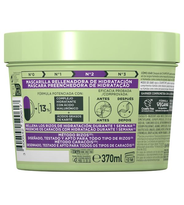 Con nuestra innovadora Mascarilla Nº2 del Método Rizos de Garnier Fructis, hemos trabajado nuestra fórmula para que tus rizos recuperen el 100% de la hidratación perdida*, ¡y eso no es todo! Te brindamos 100 horas de hidratación* para rizos increíbles. Para obtener los mejores resultados, utiliza el Champú Nº1 del Método Rizos después de aplicar el Pre-Champú Nº0.