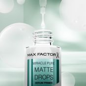 Max Factor Miracle Pure Matte Drops combina el poder de un sérum con un primer en una fórmula innovadora. • Matifica y unifica la piel al instante, creando la base perfecta para un maquillaje impecable y duradero, mientras mantiene la piel hidratada. • Su fórmula vegana, testada dermatológicamente, incorpora la tecnología Liqui-Blot™, que actúa como un papel matificante líquido para controlar el brillo y lograr un acabado mate suave. Enriquecida con ingredientes activos: niacinamida para unificar el tono de la piel y reforzar la barrera cutánea, y cica para calmar y suavizar la piel. • Apta para todo tipo de pieles. • Experimenta el poder del sérum primer: tras solo 2 semanas, el 89 % coincide* en que la piel sin maquillaje luce menos brillante, y tras 4 semanas mejora la textura de la piel sin maquillaje. *Estudio de consumidores durante 4 semanas, 115 participantes.