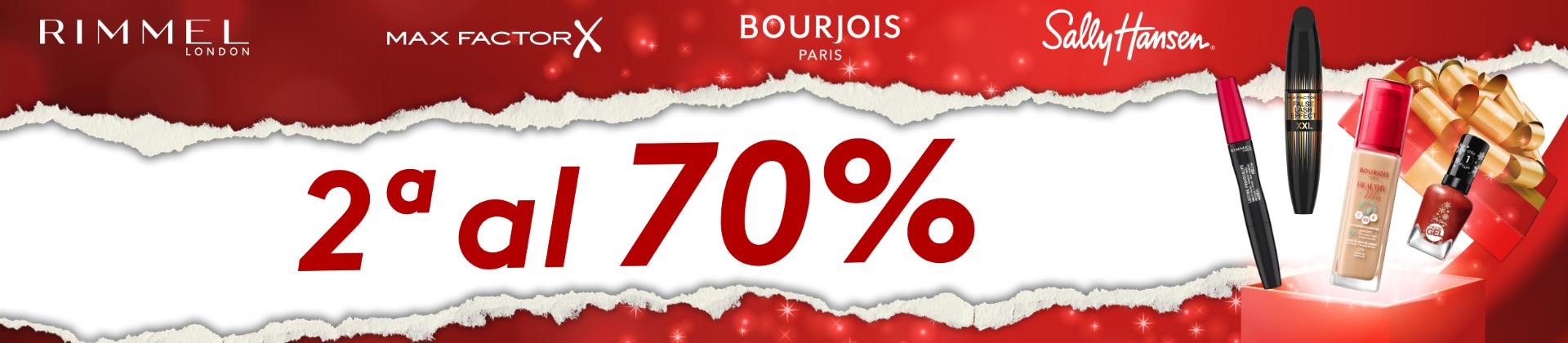 Estas fiestas, sorprende a tu persona favorita con un detalle inolvidable: ¡regala belleza! Disfruta de un increíble descuento: 2da unidad al 70% en una selección exclusiva de productos de maquillaje. Elige entre las mejores marcas como Rimmel London, Max Factor, Bourjois y Sally Hansen y renueva el look de tus seres queridos