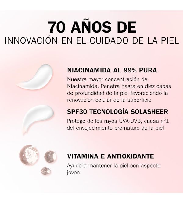 Está elaborada con Niacinamida al 99% de pureza, que penetra hasta 10 capas de profundidad en la superficie de la piel, y Vitamina E, un antioxidante de eficacia probada conocido por combatir los daños causados por los radicales libres y ayudar a mantener la piel con un aspecto joven. Disfruta del poder de la hidratación 24 horas, manteniendo tu piel hidratada durante todo el día.
