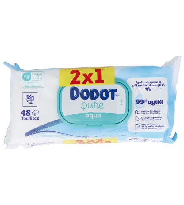 Cuidado delicado y protección para la piel de tu bebé - con 99% agua. Las toallitas Dodot Pure Aqua son más suaves que el algodón y el agua. Gracias a su fórmula única, ayudan a restaurar el pH natural de la piel, protegiendola de irritaciones. Están hechas de 0% alcohol y perfume, con fibras 100% de origen vegetal, de las cuáles 10% son algodón premium. La fórmula está dermatológicamente testada y aprobada por dermatólogos de Skin Health Alliance.