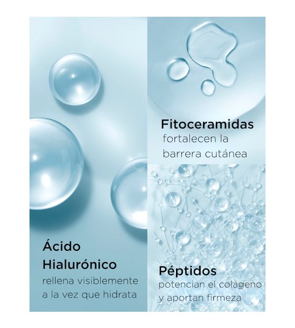 El Sérum Hidro-Rellenador de Ácido Hialurónico + Péptidos rellena, reafirma y potencia la elasticidad en la piel.